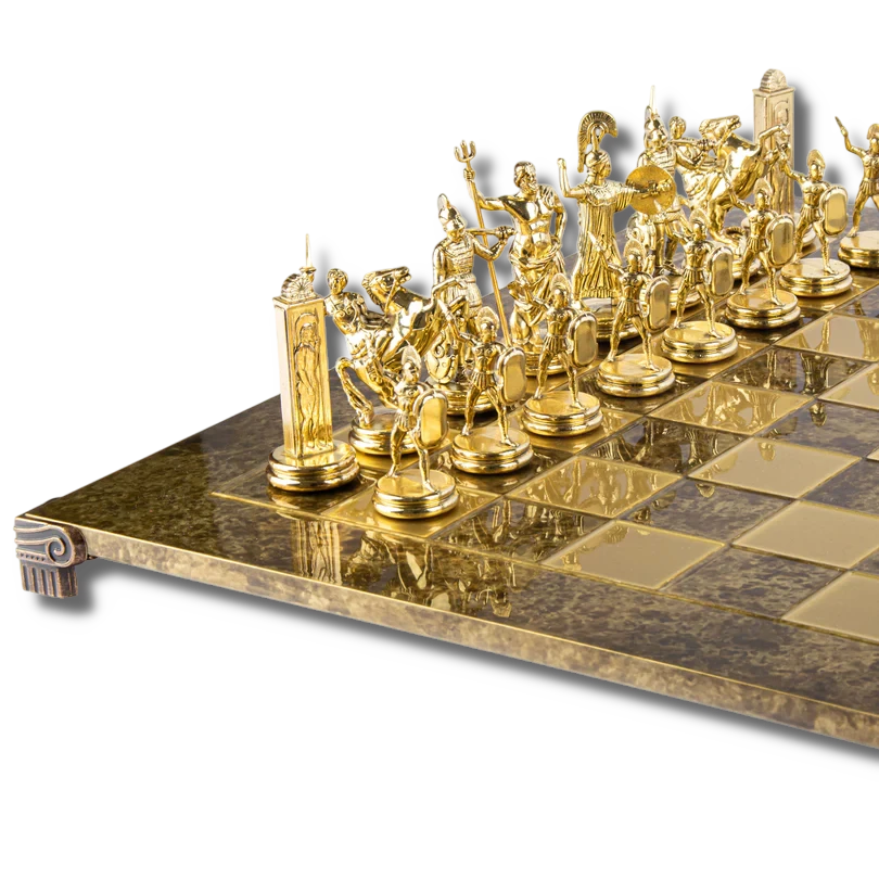 Échiquier artisanal « Mythologie » – Pièces métal « Doré et Bronze» (plateau 36 cm)